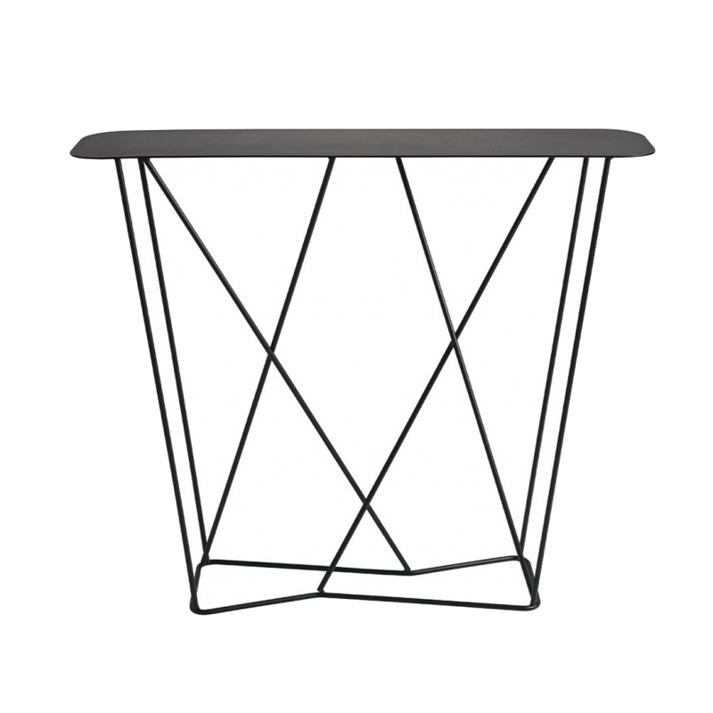 Le plateau en métal aux lignes simples et modestes est supporté par un piétement raffiné, tout en fils, qui joue uniquement sur les obliques et crée une sorte de déséquilibre visuel.