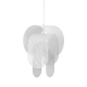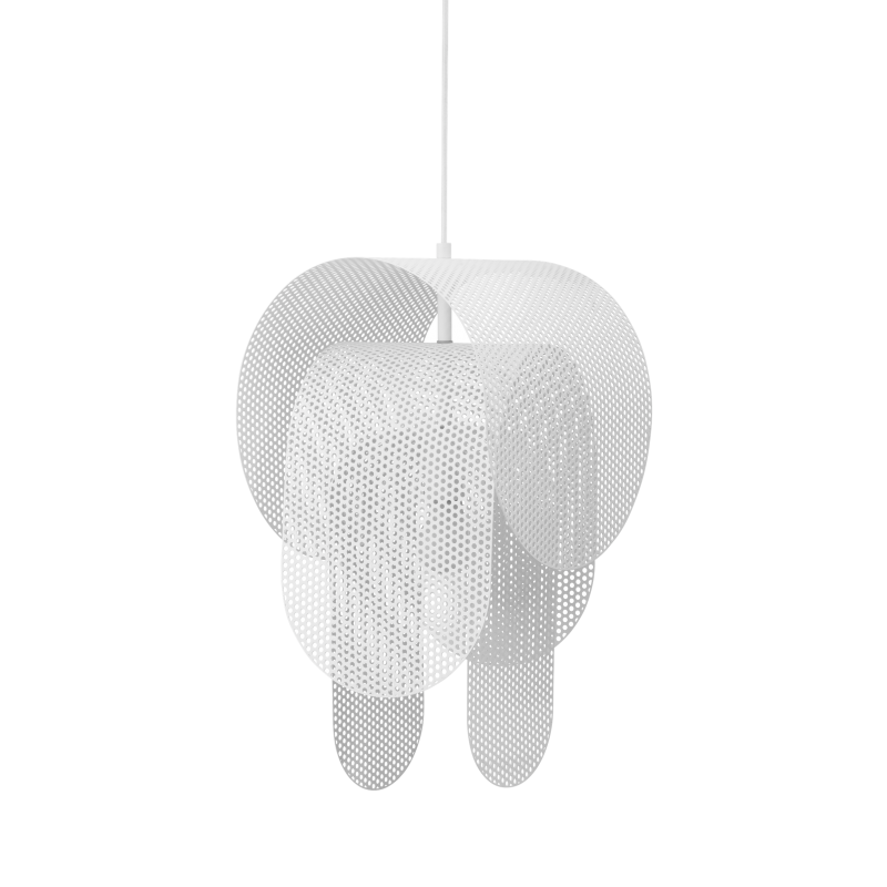 Cette lampe est constituée de trois plaques en acier soigneusement arrondies à 180°. Ces formes créées une oeuvre structurale contrebalancée par les perforations faisant de celle-ci une suspension à la fois impressionnante et légère.