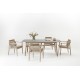 Cette collection se compose d'un canapé, de deux tables basses, d'un fauteuil, d'une table à diner et de chaises à diner.