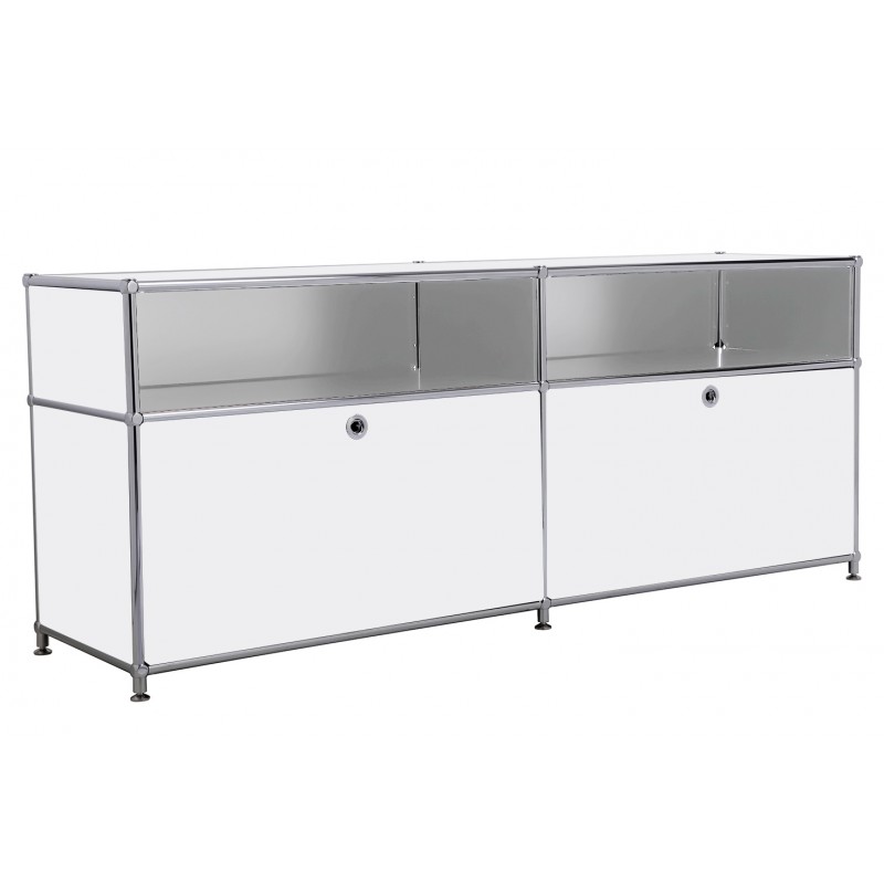 Ce meuble bas est composé de 2 modules avec portes abattantes (poignées sans serrure) et 2 rangements idéaux pour y mettre des livres ou le boitier internet. La couleur principale est blanc avec les tiges couleurs chromées.