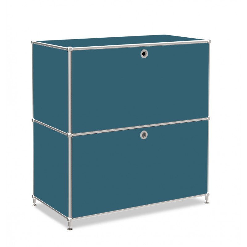 Ce buffet est composé de 2 modules avec portes abattantes (poignées sans serrure). La couleur principale est bleue essence avec les tiges couleurs chromées.