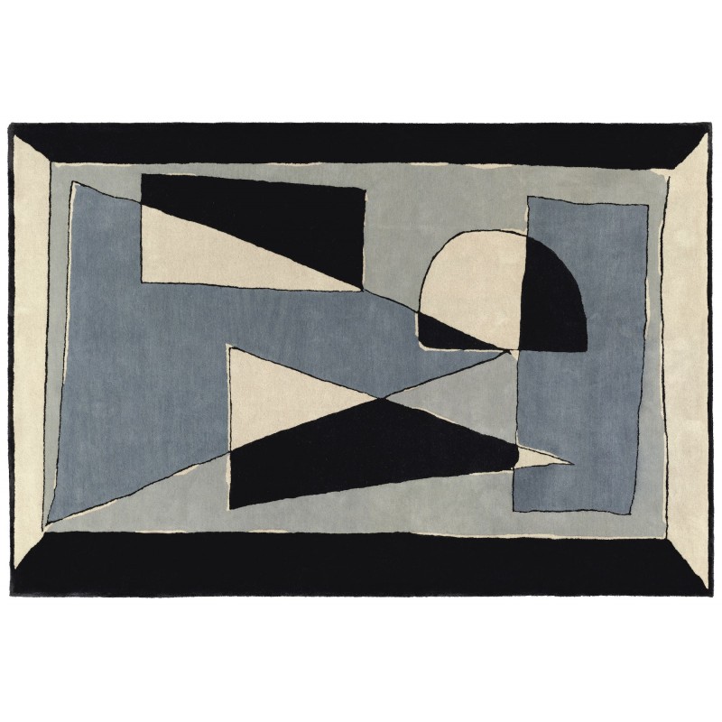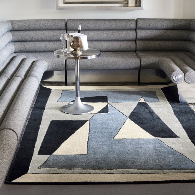 Ce tapis du fabricant français Toulemonde Bochart utilise des couleurs froides. Vincent Darré joue de lignes et de surface dans une simplicité toute mathématique. Télescopage de blancs et de noirs, la surface vibre d'effets de surbrillance.
