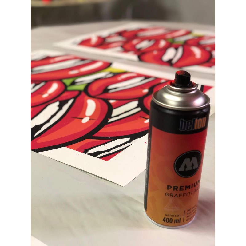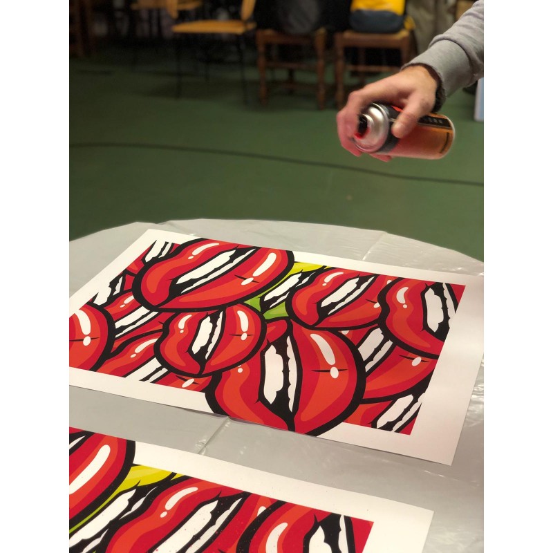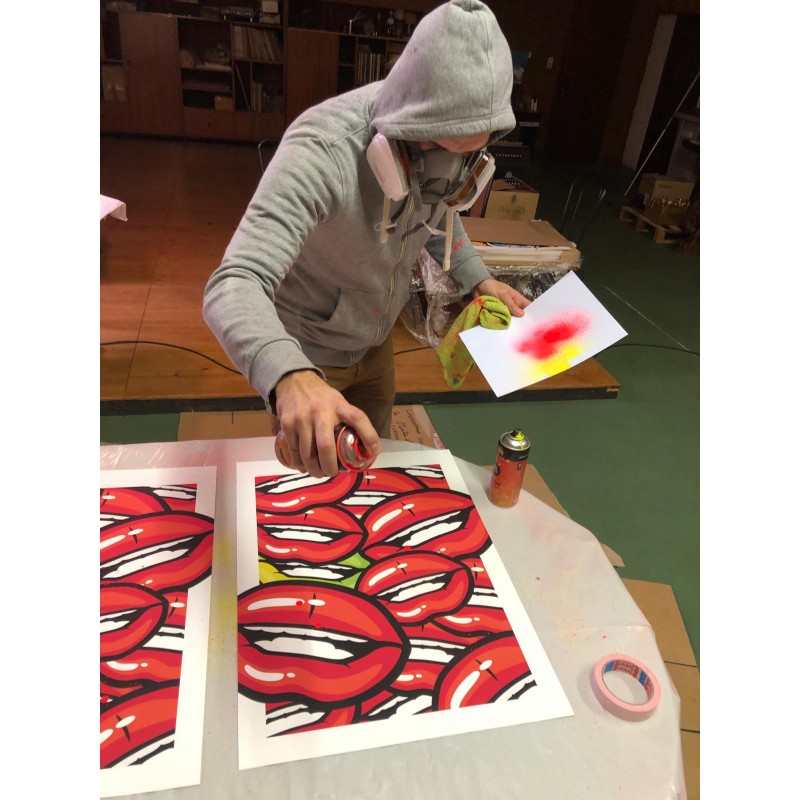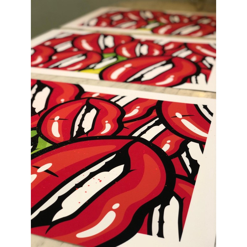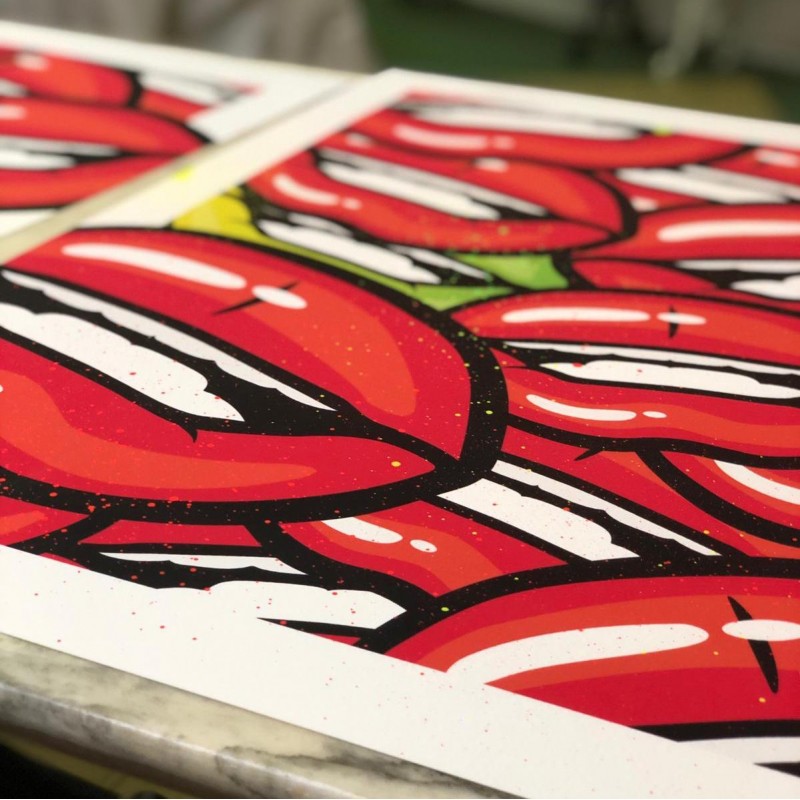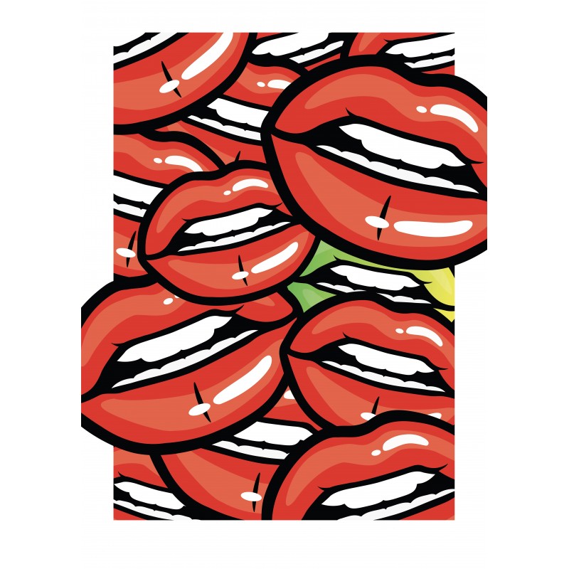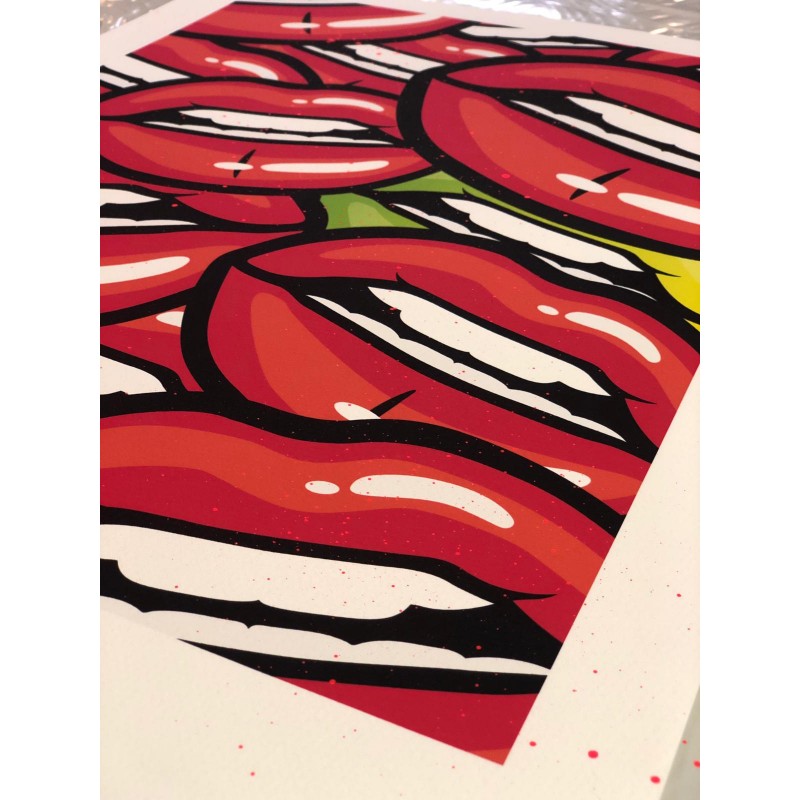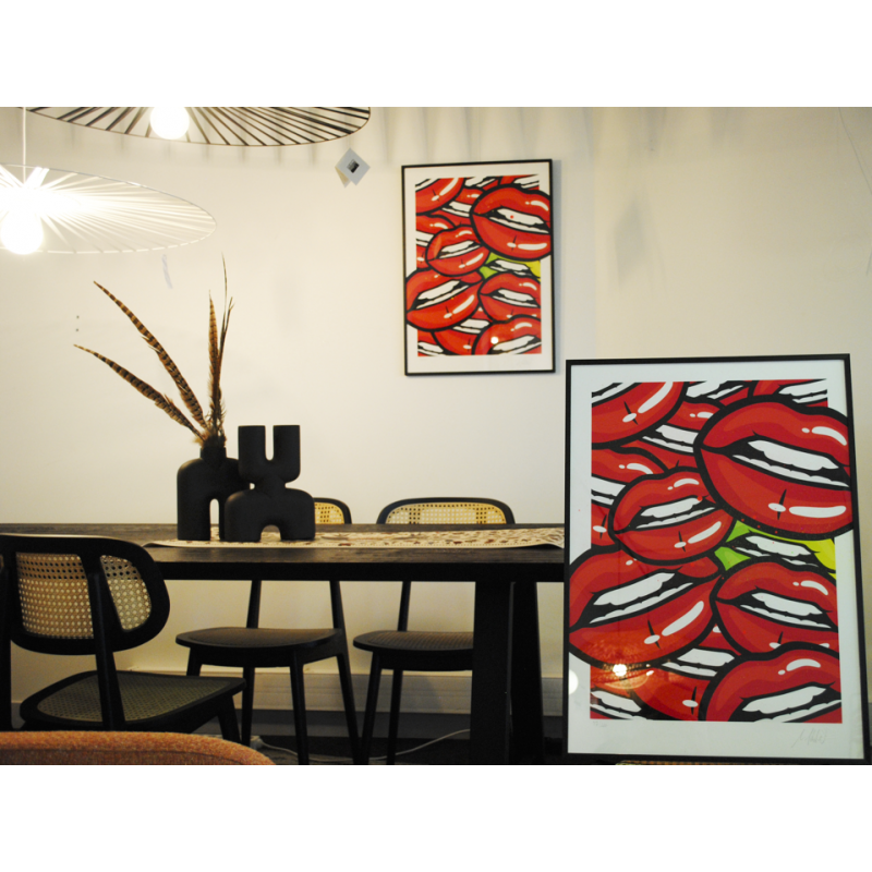Représentant une superposition de bouches inspirée des années 90, cette oeuvre signée par l'artiste apportera couleur et originalité à votre intérieur.