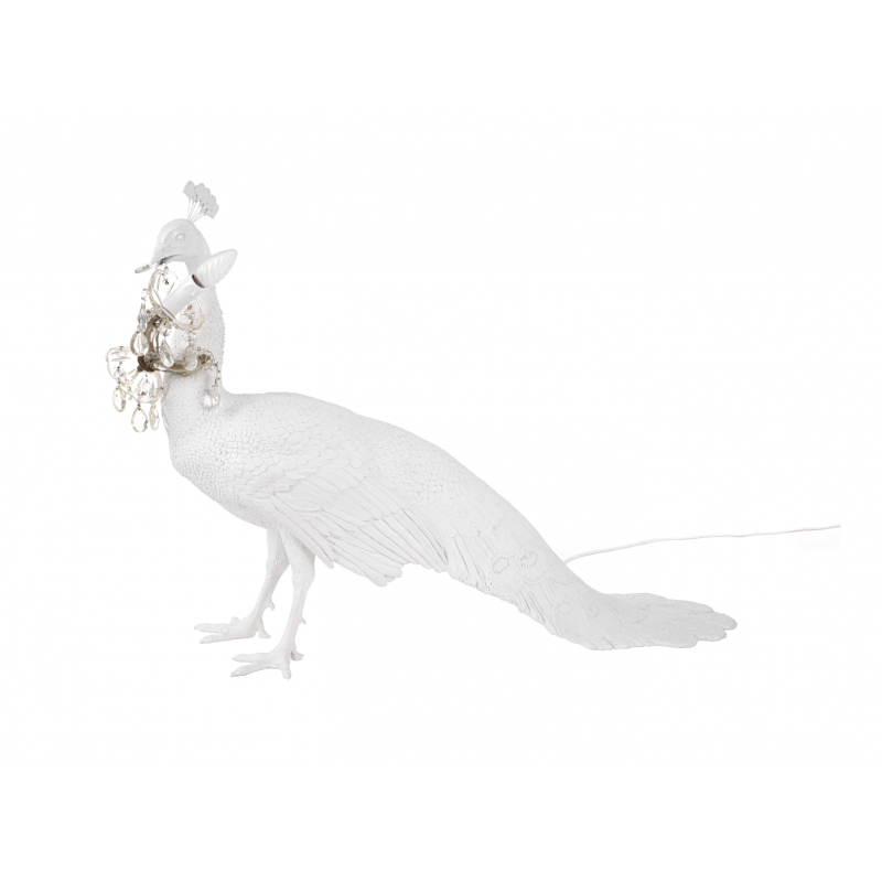Le fabricant italien Seletti continue de nous surprendre avec ce Paon en résine tenant dans son bec un lustre ancien orné de dorures.