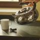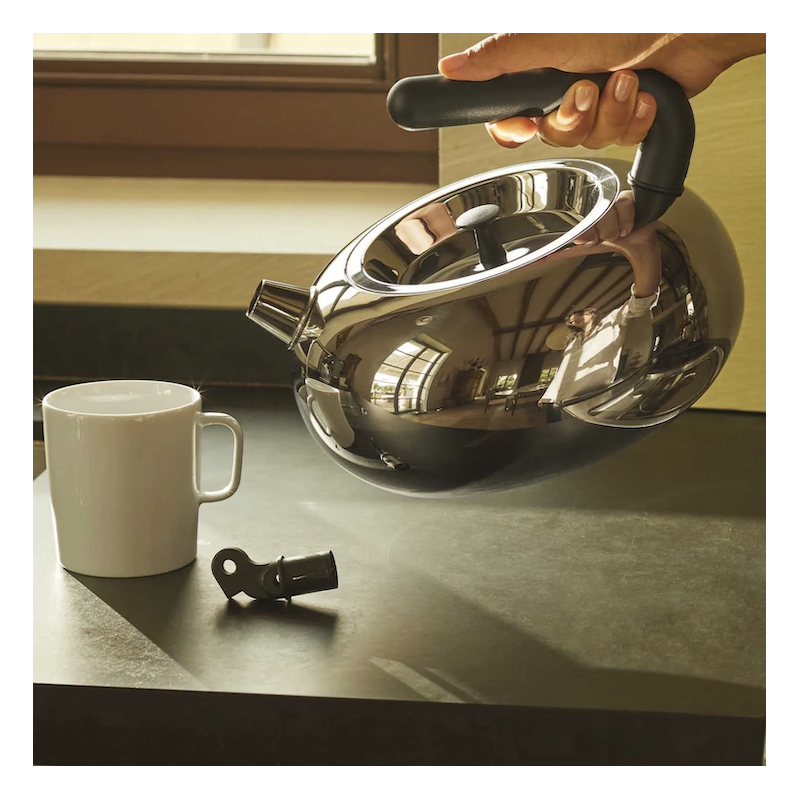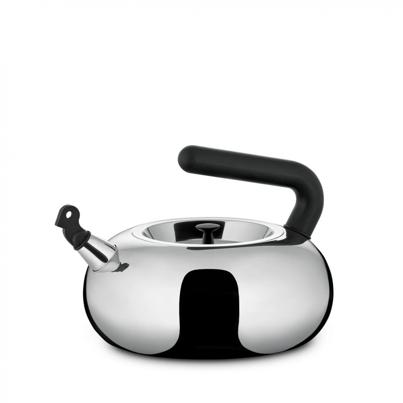 Taillée telle une pierre de curling, la bouilloire Bulbul désignée par Achille Castiglioni est un produit extravagant et original commercialisé par la marque Alessi.