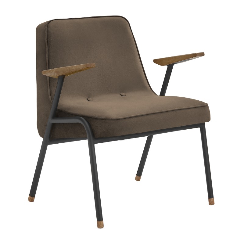 Ce modèle de fauteuil est dans le même esprit que le Fauteuil 366. Cependant avec une finition structure métal. Contrairement à ce qu'on croirai, sa finition métal ne rend pas ce modèle plus "froid". En effet, le bois de l'accoudoir apporte son lot de chaleur pour rendre ce fauteuil accueillant. Ce modèle est présenté en velours et finition chêne (accoudoir).
