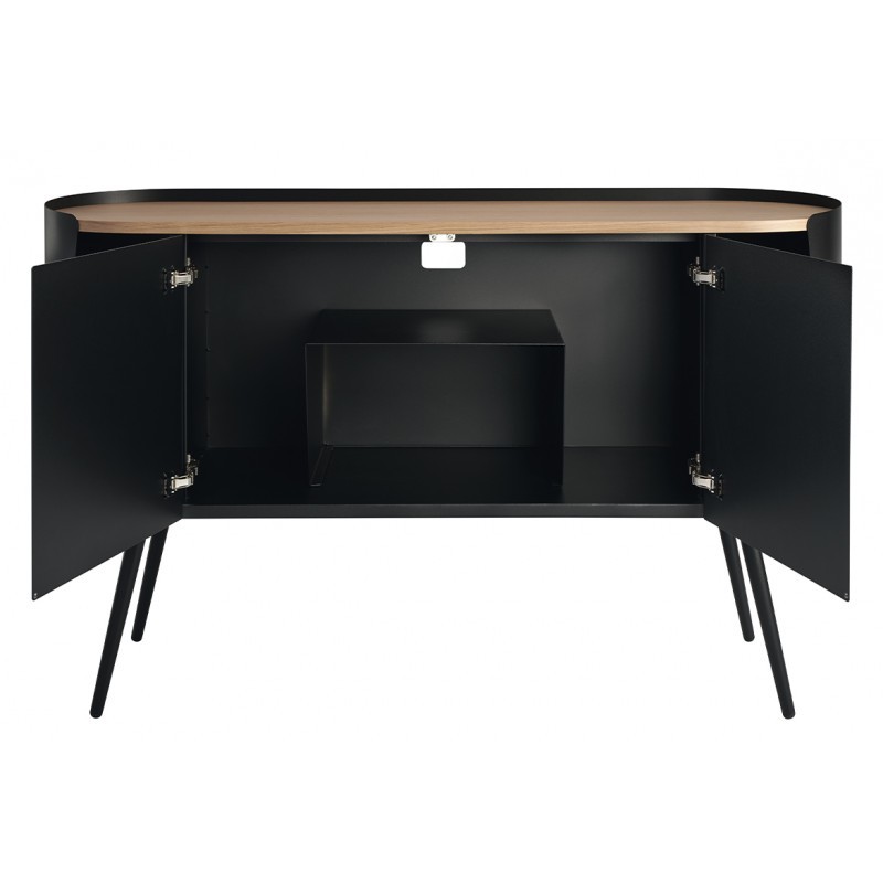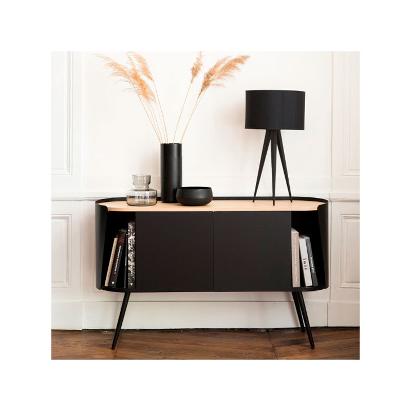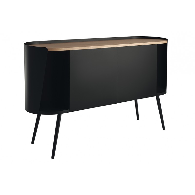 Le Buffet Armand est à la croisée du meuble vintage et de l'ultra contemporain. Ses formes arrondies qui donnent l'envie de le toucher et ses petits pieds en biais rappellent inévitablement les bahuts des années 1950. Mais toute sa modernité et sa personnalité résident dans le fait qu'il est intégralement en acier recouvert de peinture poudre Epoxy thermolaquée. Seul le sommet est en chêne massif et semble presque flotter. Les parties latérales sont ouvertes afin de laisser libre cours à vos envies de décoration.