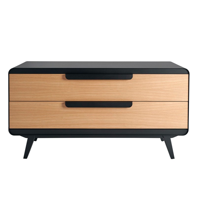 Quand les années 1950 se métissent avec le contemporain, s'ensuit un heureux mariage comme en témoigne la Commode Kapriss. Elle est éditée par la marque hexagonale Les Iresistub, qui depuis 1953 se consacre au travail du métal dans le mobilier. Elle est principalement composée d'acier et de peinture poudre Epoxy thermolaquée. Le placage chêne des deux tiroirs est la seule partie visible qui contraste avec la tôle savamment travaillée.