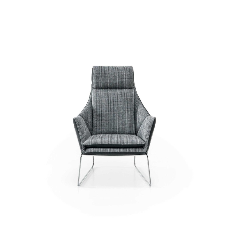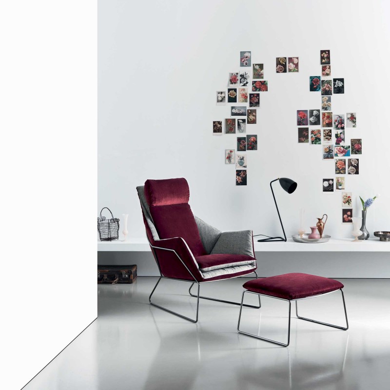 Sergio Bicego n'en a pas oublié l'histoire pour autant et a conservé toutes les bases de la bergère originelle : un dossier haut et rembourré, des joues pleines, des manchettes et un coussin sur l'assise. Mais ici, les coussins sont encadrés par une ossature moderne et aérienne en fils d'acier.