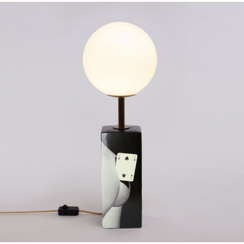 La base de la lampe est en porcelaine, sur laquelle une tige en métal doré est fixée. Le tout est dominé par un globe lumineux en verre contenant une ampoule LED.