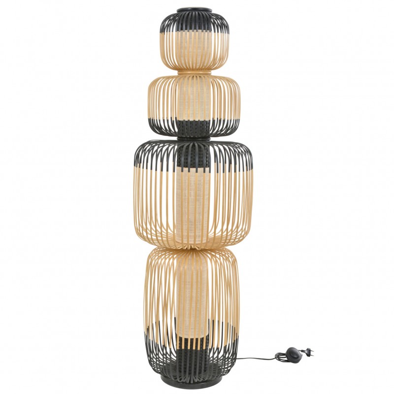 Son socle est en métal et les abat-jour superposés les uns aux autres, tous différents, sont en lames de bambou bicolores. La lumière est tamisée et semble s'immiscer par faisceaux entre les lamelles pour jouer avec vos murs et meubles.