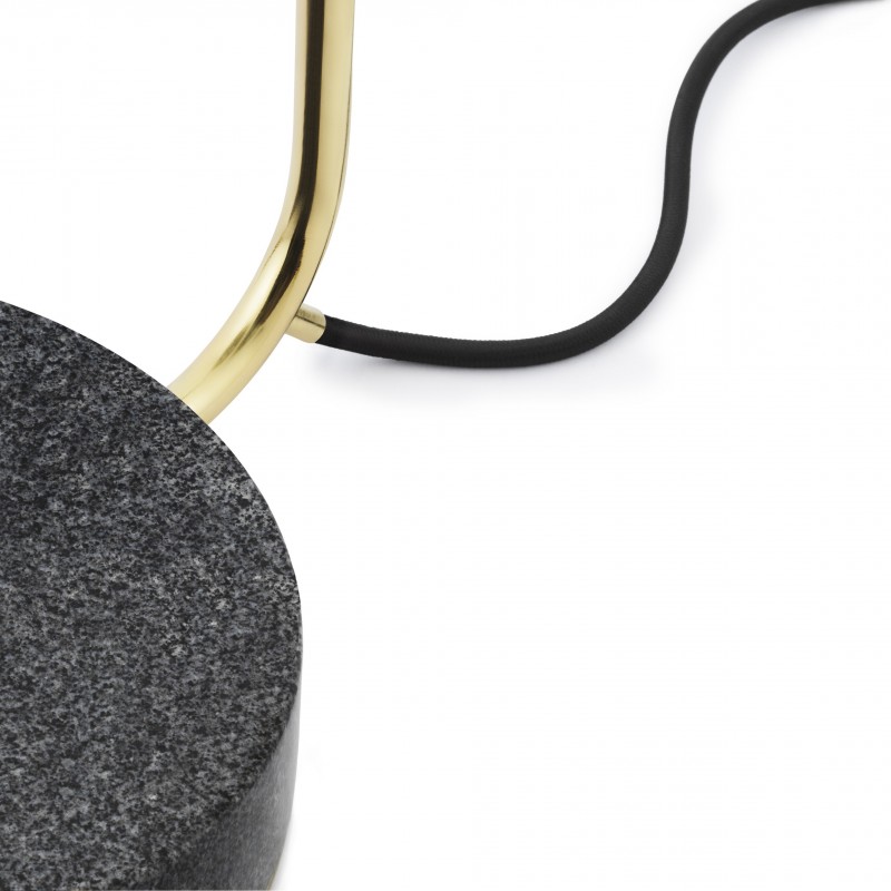 Édité par la maison danoise Normann Copenhagen, ce luminaire oppose et harmonise en même temps un solide socle en granit gris et un abat-jour en laiton poli. L'aspect brut de la base s'équilibre avec la douceur et l'éclat de sa demi-sphère et de sa tige légèrement inclinée.