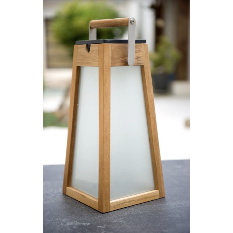 Lampe solaire teck, lanterne nomade, solaire, en verre dépoli et acrylique.