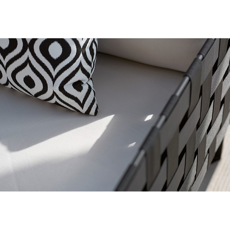 - Matériau : En aluminium laqué mat blanc, polyester tissé et coussins en tissu gris.