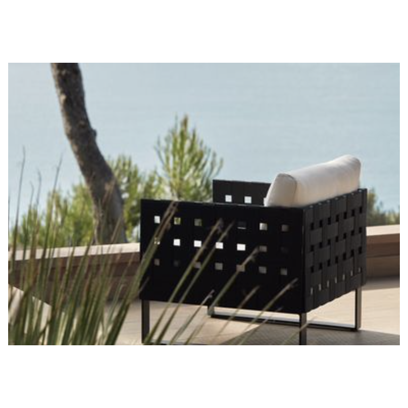 L'extérieur est leur lieu de prédilection avec des matériaux résistants aux intempéries. Pour cela, le piètement en aluminium et un tissu tout acrylique Sunbrella épais et confortable pour les différents coussins ont été repris.
