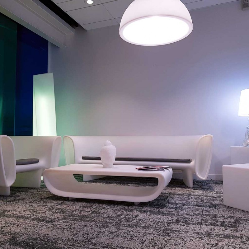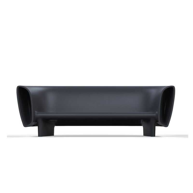 Ce canapé est en premier lieu une démonstration de technologie car totalement en résine de polyéthylène par rotomoulage à double parois. Il est ainsi résistant, pérenne et léger pour l'extérieur. Son incroyable forme tubulaire rappelle la silhouette de certains instruments à vent à qui l'on aurait greffé à chaque extrémité des enceintes. Enceintes qui sont peut-être à l'origine de son nom rappelant le "Boum" que font les basses en concert. Remarqué et remarquable, le canapé Bum Bum est un savant mix d'un contemporain qui aurait croisé la route des seventies et qui n'aurait en rien dénoter dans le décor du film "Orange mécanique".