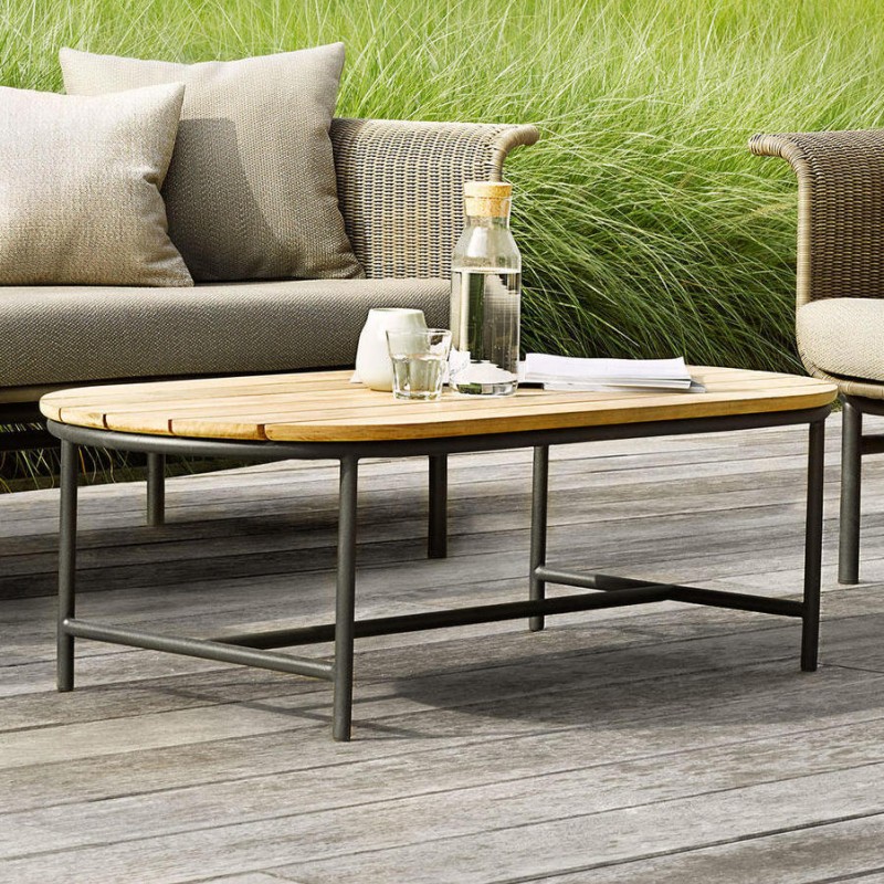 Austérité et minimalisme du piètement contrastent avec l’ovale doux du plateau en teck massif.