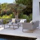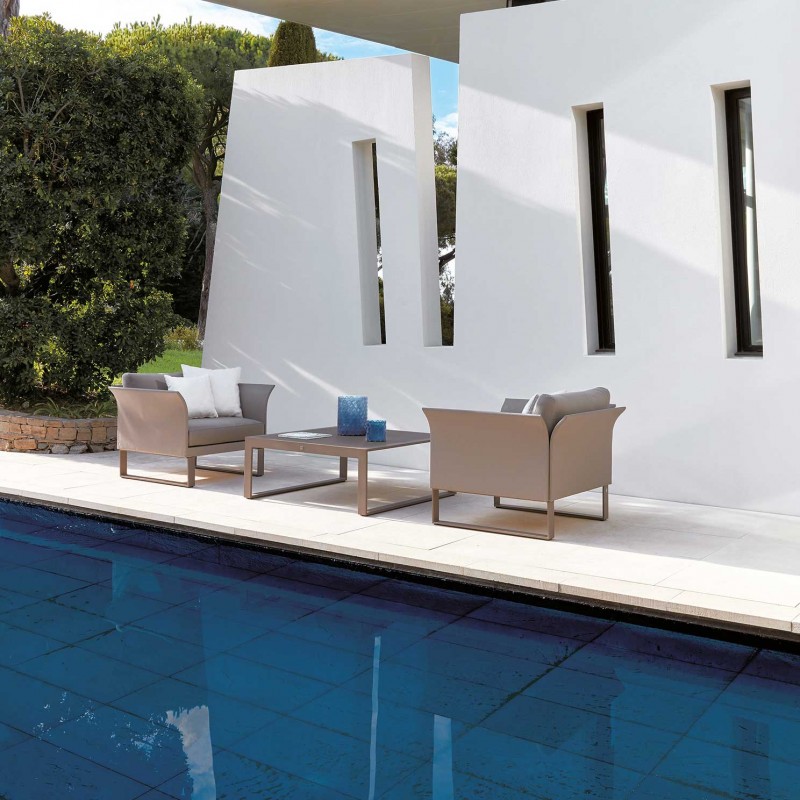 L'extérieur est leur lieu de prédilection avec des matériaux résistants aux intempéries. Pour cela, le piètement en aluminium et un tissu tout acrylique Sunbrella épais et confortable pour les différents coussins ont été repris.