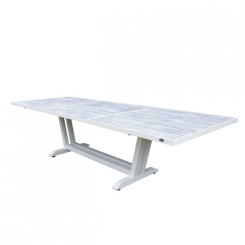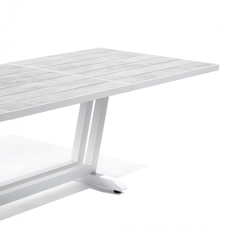 - Matériau : Structure en aluminium blanc et plateau latté en HPL finition béton ciré, système de rallonge par levier, pied central.