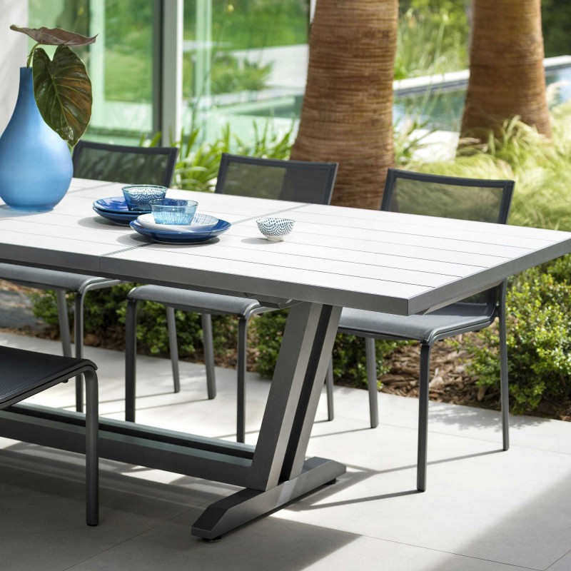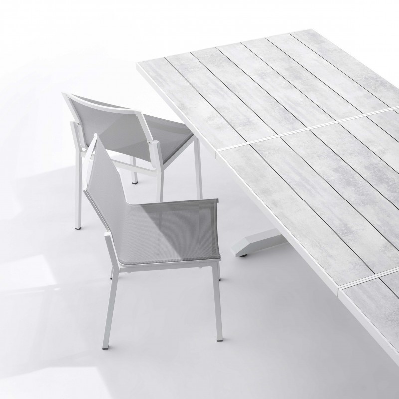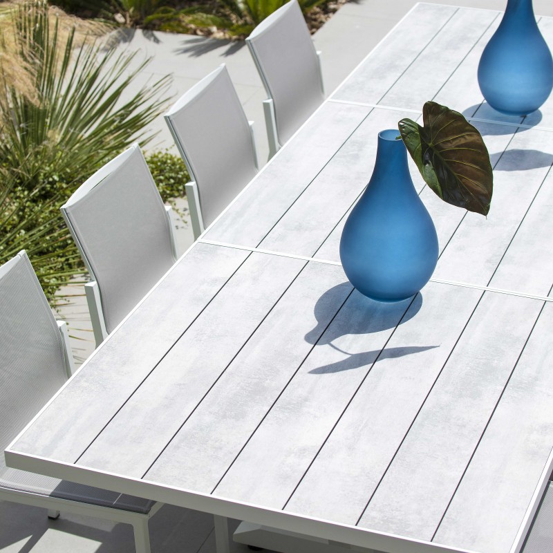 Le piètement est composé d'obliques en aluminium qui assurent une longévité pérenne au mobilier. En HPL et hautement technologique, le plateau aux finitions béton ciré résiste de moins 20 degrés à une température supérieure à 150 degrés Celsius.