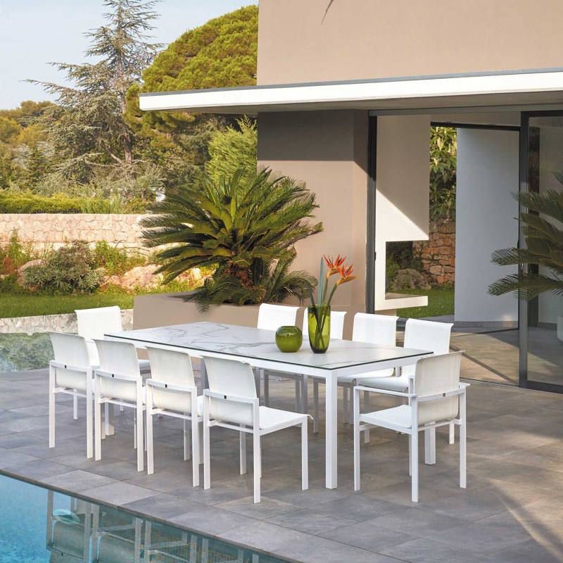 Fidèle à la réputation de la marque où la solidité est une référence essentielle, la structure est en aluminium laqué combiné à une toile en polyester tissé qui joue le double rôle de confort et résistance.