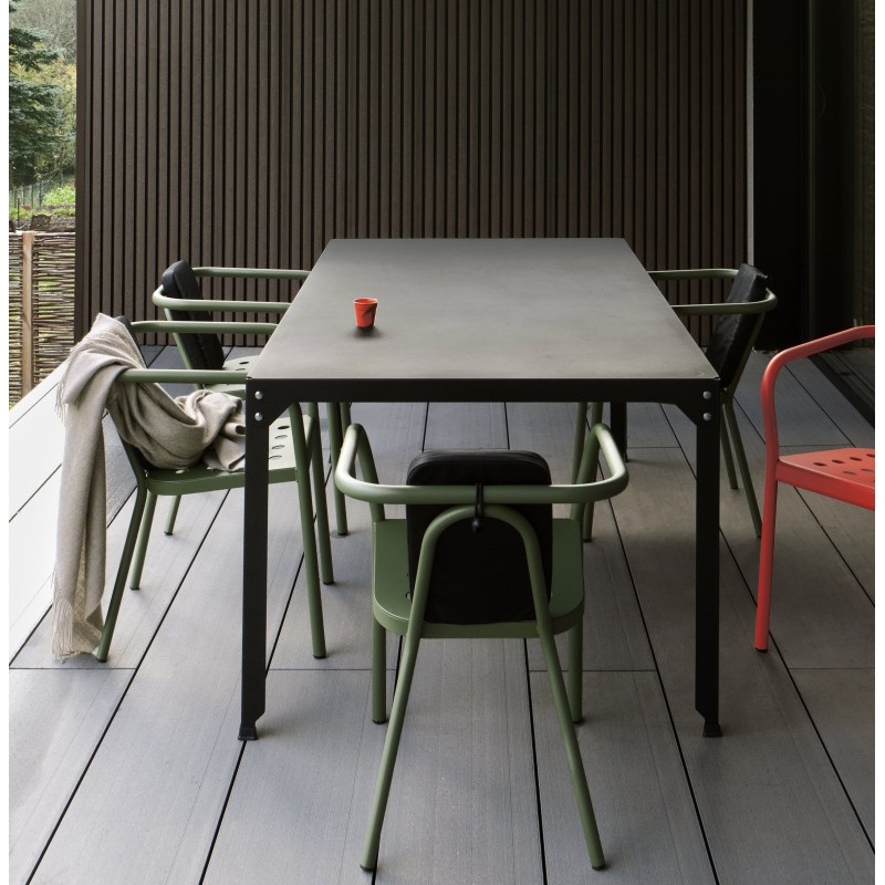 Sa forme rectangulaire et ses larges dimensions donnent à cette table un aspect convivial que l'on trouvait dans les grandes tablées des cuisines d'antan. Résolument innovante, elle est en acier galvanisé associé à de la peinture poudre Epoxy afin de pouvoir être installée dans votre jardin et résister aux intempéries.
