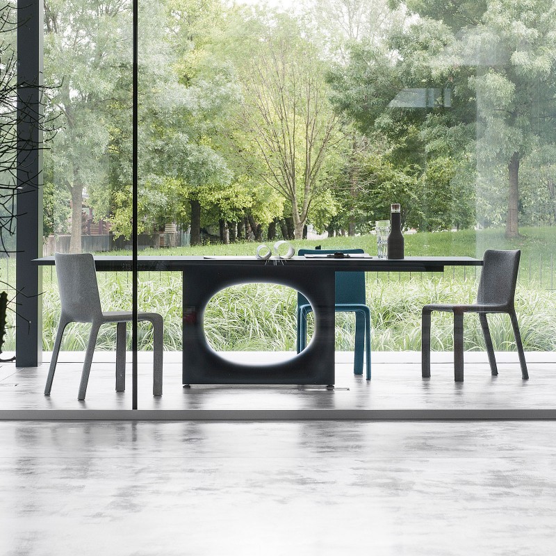 Une grande partie de son essence réside essentiellement dans son piètement en tôle d'acier et de son ouverture ovale en son centre totalement originale. De massive, la partie inférieure devient légère et attise inévitablement la curiosité tant sa forme est inédite.