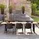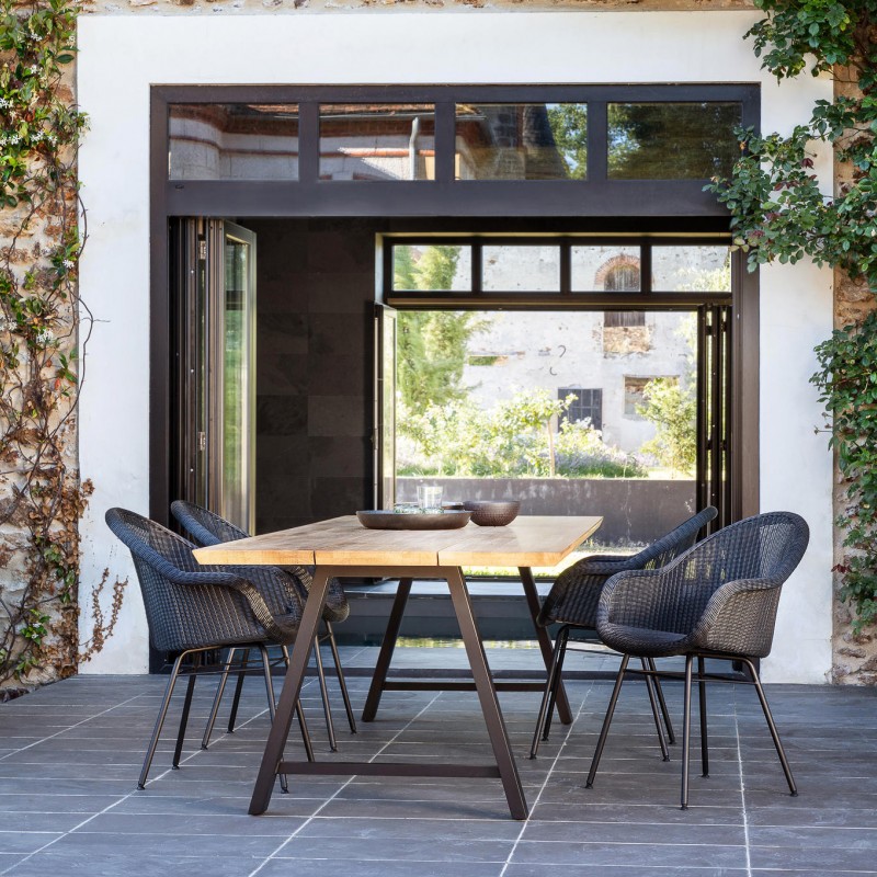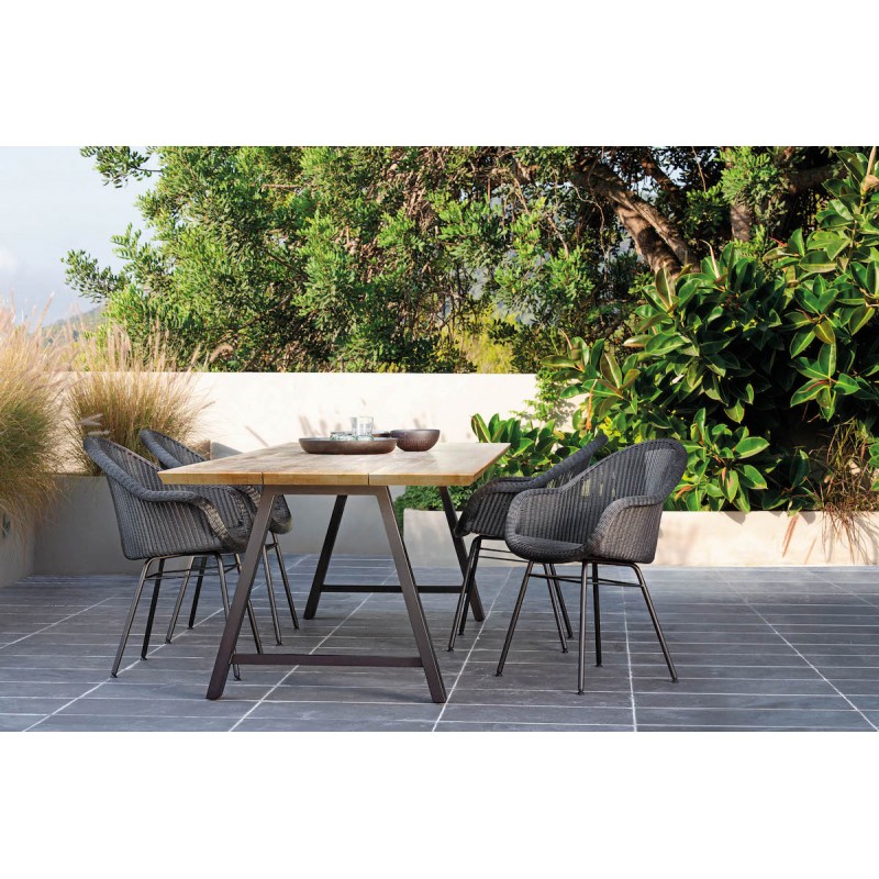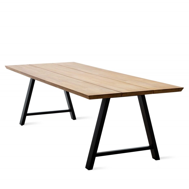 Parfait pour l’outdoor, le piètement en aluminium sert de base à un plateau en teck massif. Ce dernier est composé de 3 simples planches qui ne sont pas sans rappeler l'aspect brut mais convivial de certaines tables de campagne où il fait bon se réunir.